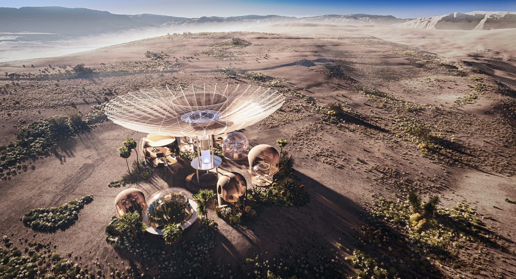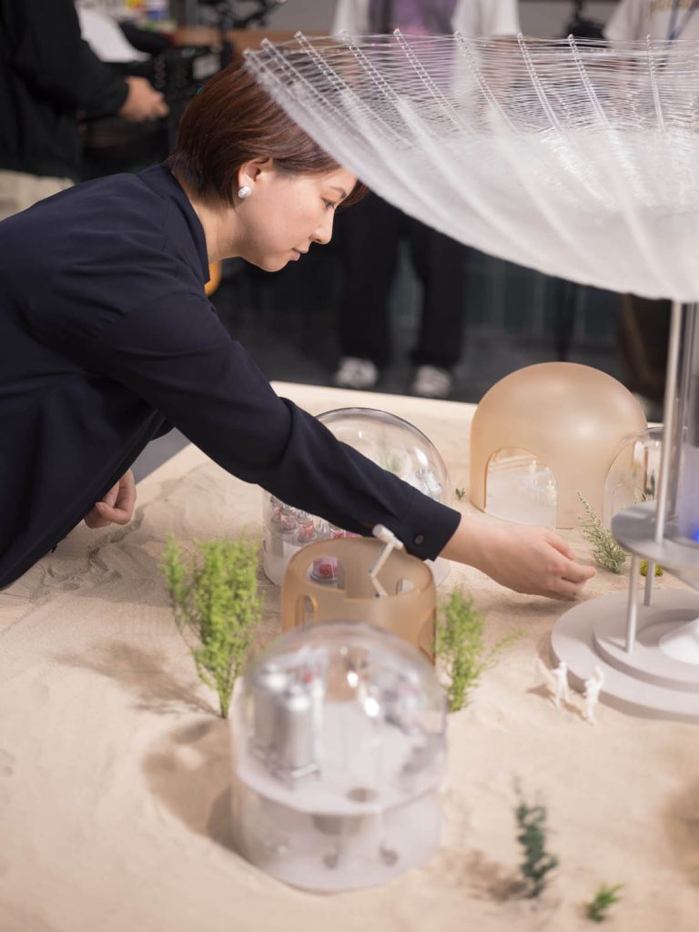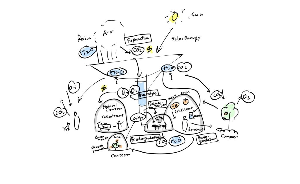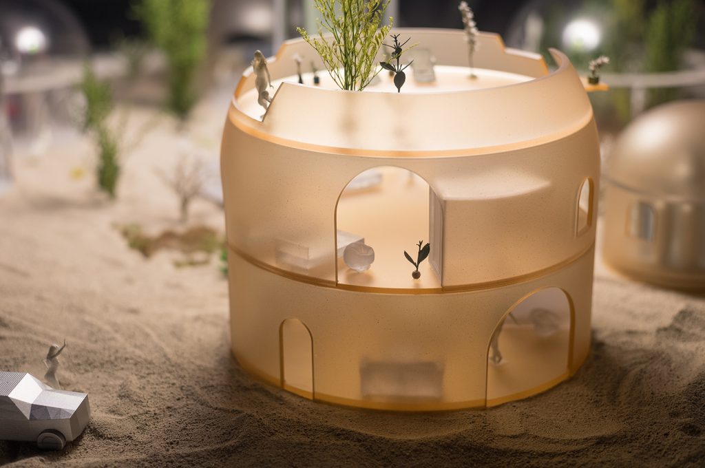 将来的にはよりCO₂濃度が高い火星などの宇宙空間への適応を見据え、材料効率や強度的に有利なドーム状の居住空間をその場の素材を活用することで生成し、閉鎖空間で物質循環を行いながら生活する未来を想定している。そこでは異なる惑星での新しい土着性が生み出される風景を想像している。