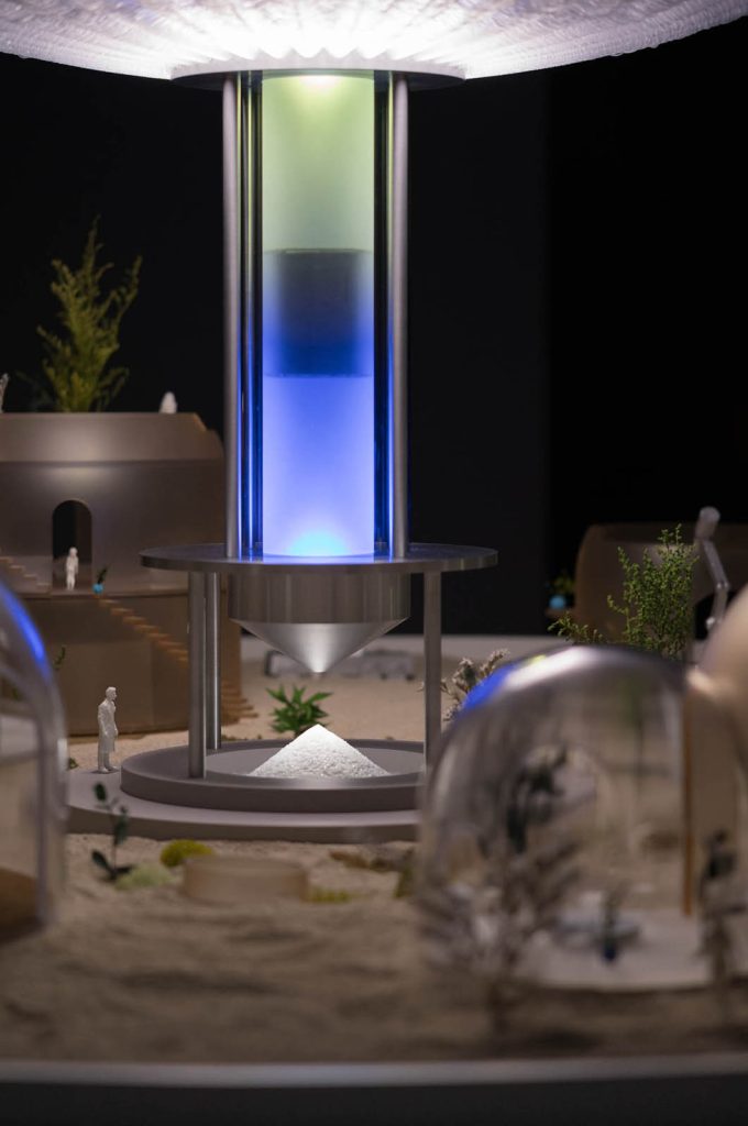 敷地は、一般的な資源が乏しい過酷な砂漠を想定し、空気中のCO₂から直接資源を生み出すこの技術の特異性を最大限に活かしつつ、生成された樹脂には、現地の砂漠の砂を骨材として混ぜる。それによって材料強度を増すと同時に、周囲の風景に溶け込むヴァナキュラー(土着的な)建築の様相を呈し、DAC-Uシステムと地域固有の景観が融合した未来の風景を創出する。