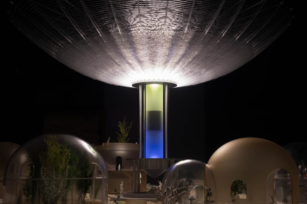 The captured CO₂ is channeled downward through transparent dual-layer cylinders. The outer layer is filled with an electrolyte, while CO₂ passes through the inner layer. As the gas comes into contact with the electrodes between them, it undergoes highly efficient electrochemical reduction into ethylene gas, which is then collected in tanks at the base. Through the power of chemistry, this ethylene is transformed into materials such as polyurethane and polycarbonate, enabling the creation of substances with diverse properties. This process mirrors the way plants generate trunks and leaves from CO₂: an inorganic substance transformed into the organic “body” of architecture. The symbolic “Tree of Life” was designed to embody this entire cycle.